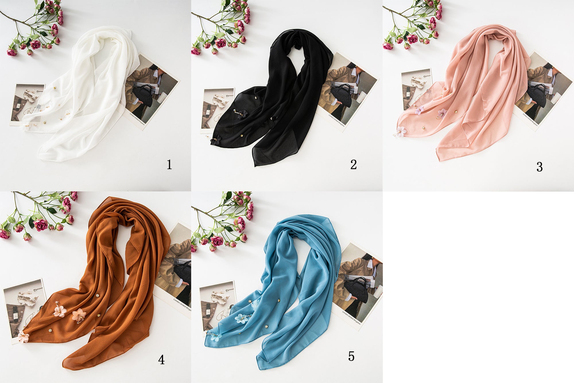 W-0900 90*90 bufanda hijab pañuelo liso de gasa con perlas y flores