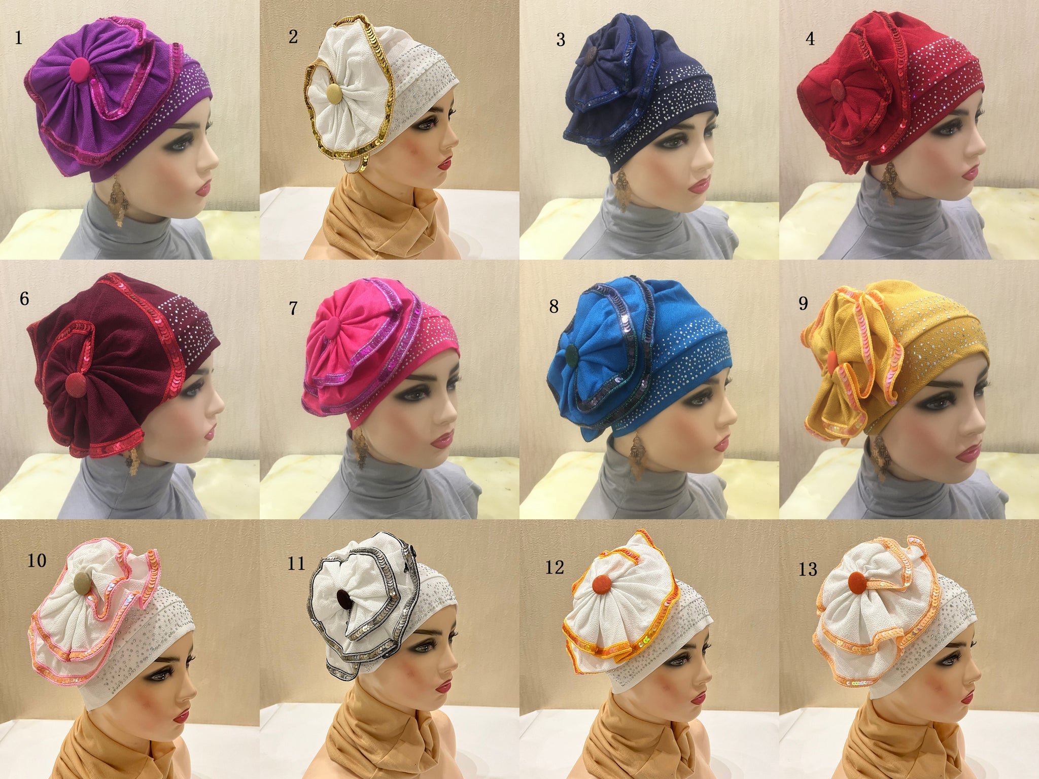 H140 estampado de diamantes de imitación sombrero turbante de flores