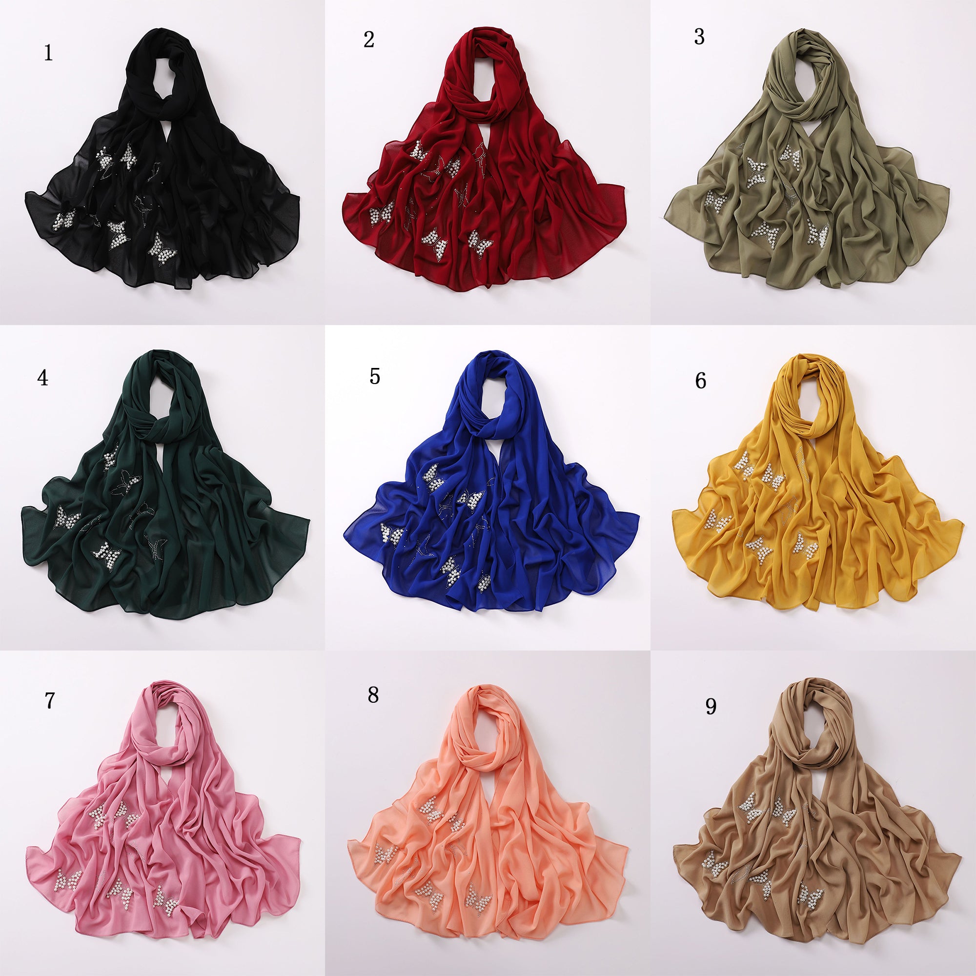 W-0092 plain chiffon butterfly nail beads hijab scarf